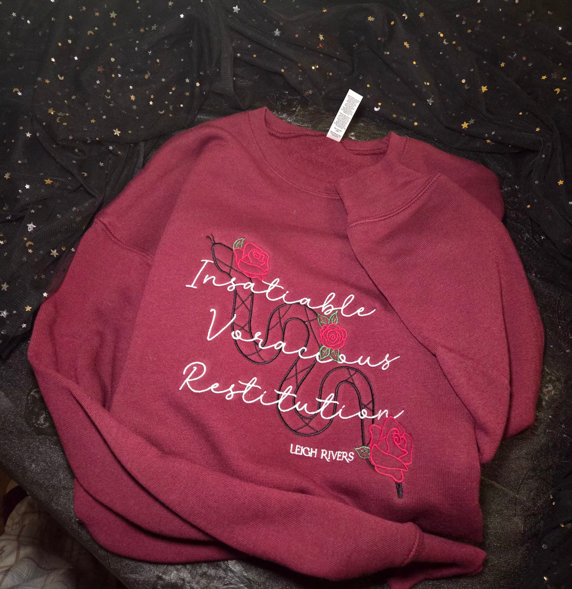 Featuring the three iconic titles from Leigh Rivers’ Edge of Darkness trilogy. Insatiable, Voracious, and Restitution. This embroidered sweatshirt is a subtle yet powerful nod for readers who know exactly what these words mean. Intertwined with dark serpent linework and romantic rose details, this design captures the obsession, intensity, and emotional depth that define the series.