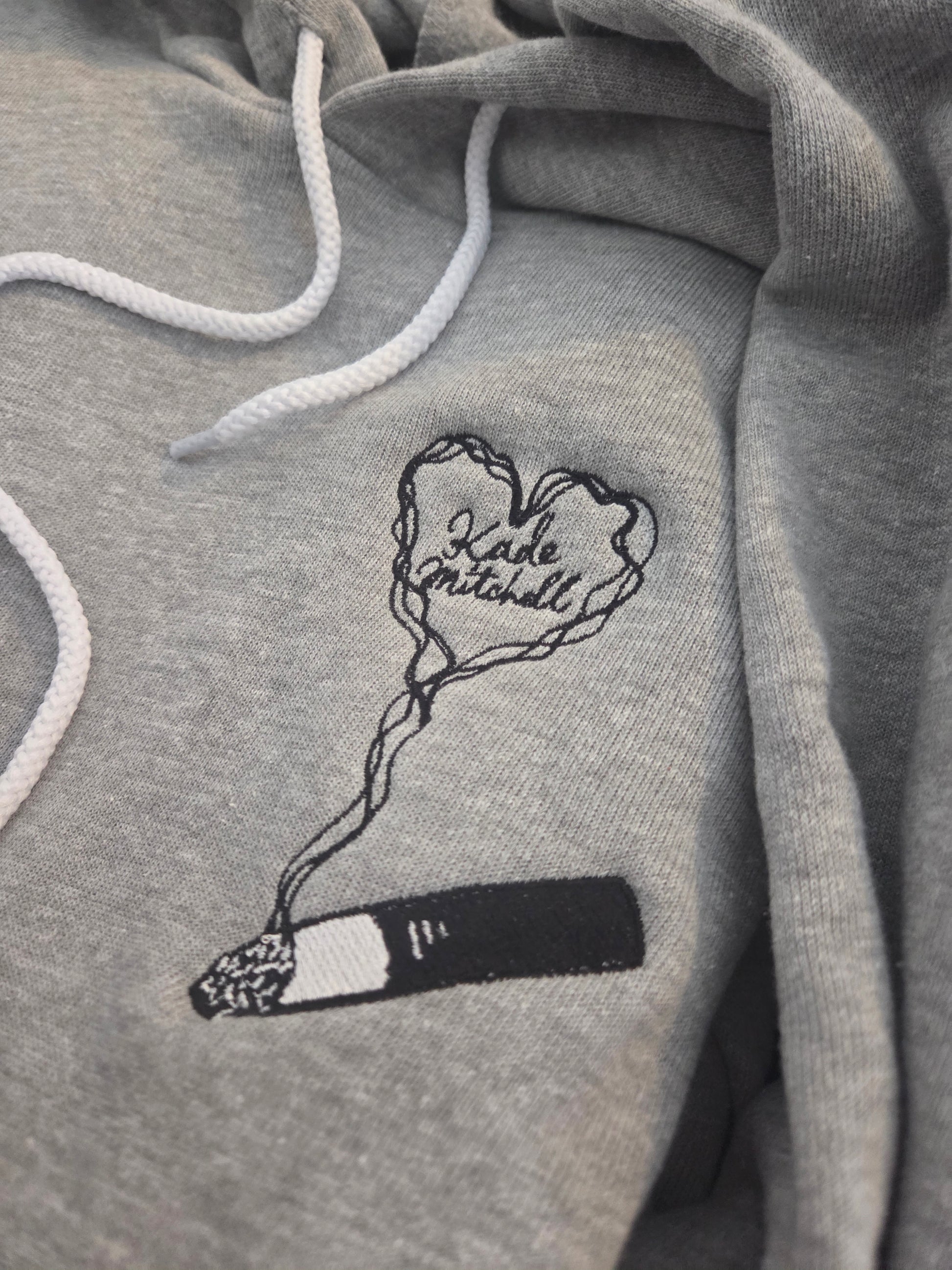 Soft, cozy and just a little bit unhinged (in the fun way). This hoodie features a minimalist embroidered design of a cigarette with smoke drifting into a heart that reads "Kade Mitchell"